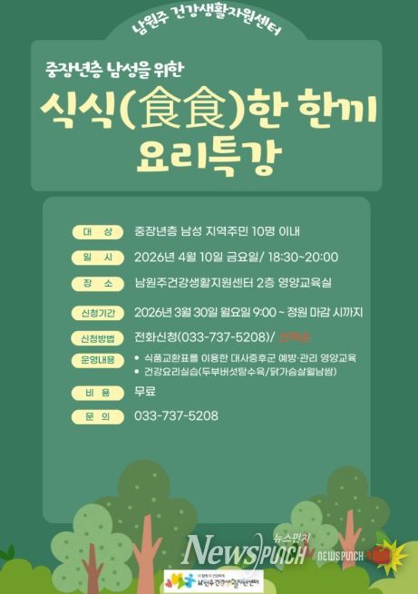 뉴스펀치 조평훈 기자 | 남원주건강생활지원센터는 영양 교육 및 건강 요리 실습 기회가 적은 중장년 남성을 위한 ‘식식(食食)한 한끼’ 프로그램 참여자를 모집한다.