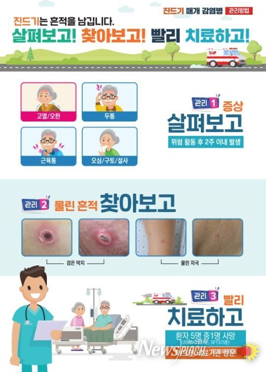 보건소 관계자는 “진드기 매개 감염병 예방을 위해 긴소매 상의와 긴바지를 착용하고 풀밭에 직접 앉거나 옷을 벗어두지 말고 작업복과 일상복은 구분하여 착용하며 외출 후 즉시 샤워하고 입었던 옷은 바로 세탁하는 것이 중요하다.”라고 전했다.