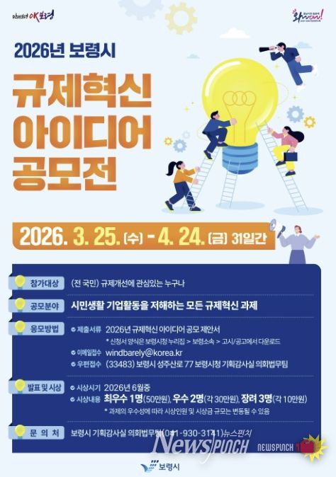 뉴스펀치 이현승 기자 | 보령시는 3월 25일부터 4월 24일까지 31일간 ‘2026년 보령시 규제혁신 아이디어 공모전’을 개최한다고 밝혔다.