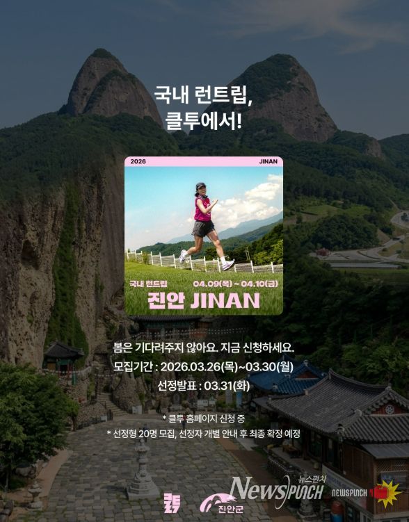 뉴스펀치 정홍균 기자 | 진안군이 ‘2026-2027 진안 방문의 해’를 맞아 러닝 기반 여행 플랫폼 ‘클투(CLTOO)와 협업해 청정 자연 속에서 러닝과 휴식을 동시에 즐길 수 있는 ‘2026 진안 벚꽃·웰니스 힐링 런트립’을 오는 4월 9일부터 10일까지 1박 2일간 진행한다.