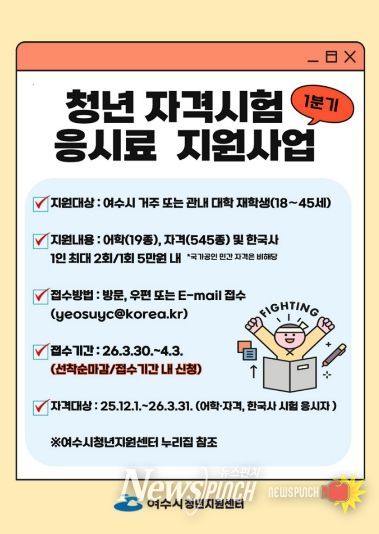 뉴스펀치 김용희 기자 | 여수시가 청년들의 취업 경쟁력 강화와 자격 취득 역량 향상, 경제적 부담 완화를 위해 ‘청년 자격시험 응시료 지원사업’을 추진한다.