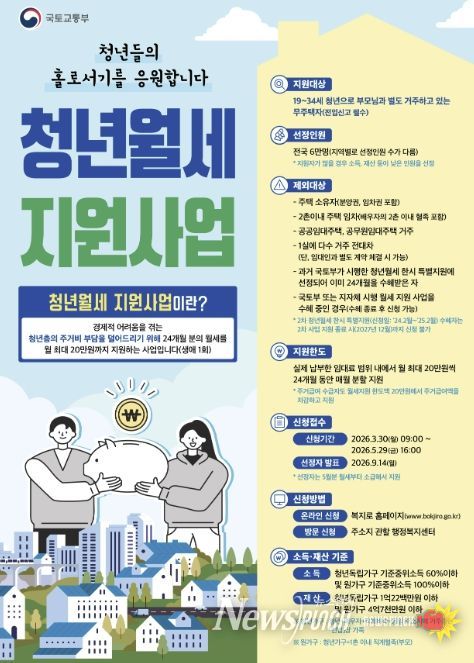 지원 대상은 부모와 별도로 거주하는 만 19세부터 34세까지의 무주택 청년이며, 선정된 대상자에게는 생애 1회 최대 24개월 동안 월 최대 20만 원의 임차료를 지원한다.