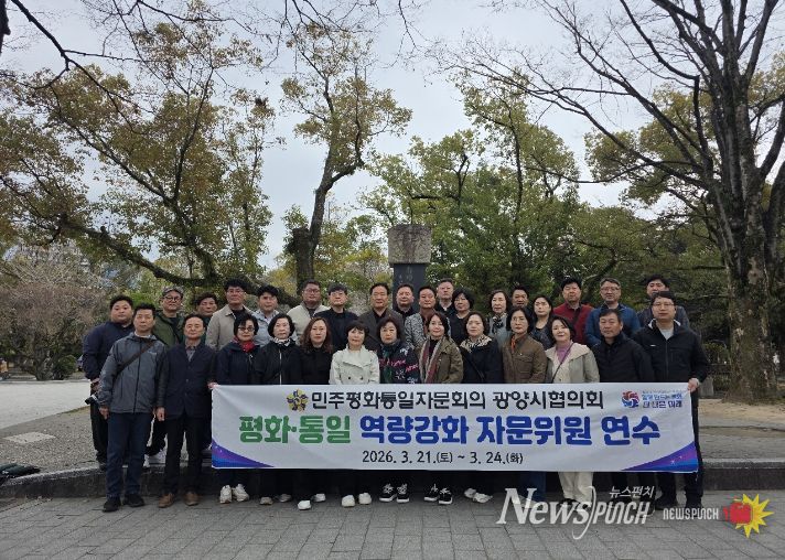 뉴스펀치 김용희 기자 | 민주평화통일자문회의 광양시협의회(회장 박노신)는 3월 21일부터 24일까지 3박 4일간 일본 히로시마 일원에서 자문위원 32명이 참여한 가운데 ‘2026년 평화·통일 역량 강화 자문위원 연수’를 실시했다.
