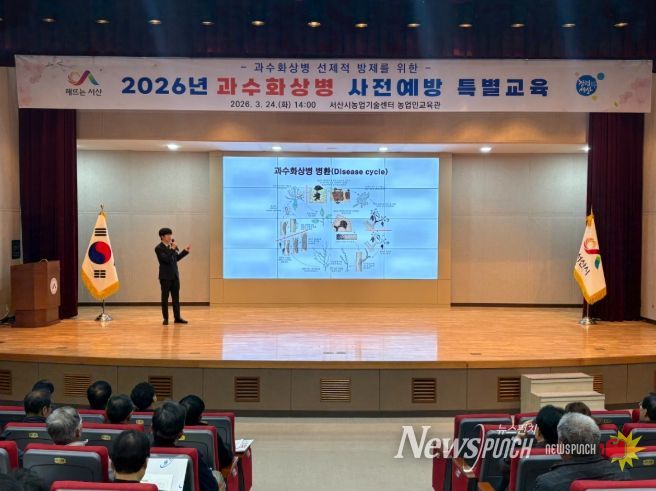 뉴스펀치 이현승 기자 | 서산시는 24일 농업기술센터에서 관내 사과·배 재배 농업인을 대상으로 ‘2026년 과수화상병 사전예방 교육’을 실시하고 방제약제를 무상 공급했다고 밝혔다.