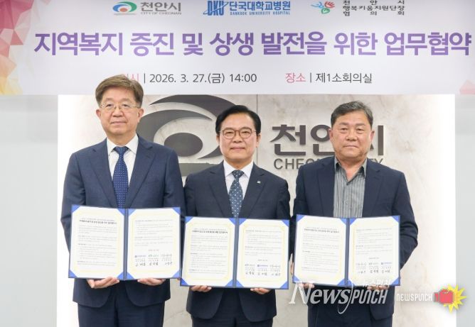 뉴스펀치 이현승 기자 | 천안시는 27일 시청 제1소회의실에서 단국대학교병원, 천안시행복키움지원단장 협의회와 지역복지 증진 및 상생 발전을 위한 업무협약을 체결했다.