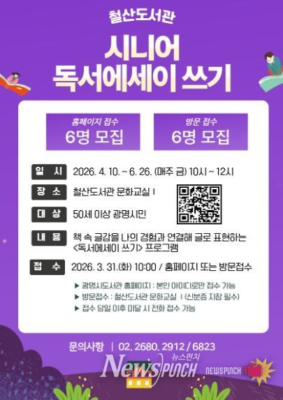 뉴스펀치 박상훈 기자 | 광명시 철산도서관이 신중년 대상 ‘시니어 독서에세이 쓰기’ 프로그램 수강생을 오는 31일부터 모집한다.