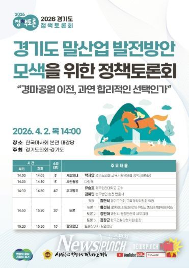 뉴스펀치 박상훈 기자 | 경기도의회 교육기획위원회 김현석 의원(국민의힘, 과천)은 오는 2일 오후 2시 한국마사회 본관 대강당에서 ‘경기도 말산업 발전방안 모색을 위한 정책토론회’를 개최한다고 밝혔다.
