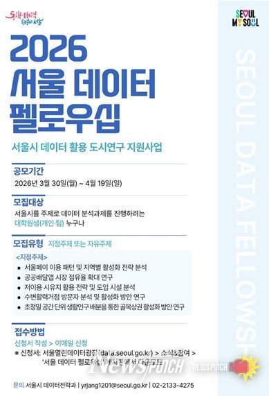 시는 3월 30일부터 4월 19일까지 ‘2026 서울 데이터 펠로우십’ 참여자를 모집하고, 대학원생 등 청년 분석 인재를 중심으로 도시문제 해결 프로젝트를 추진한다고 밝혔다.