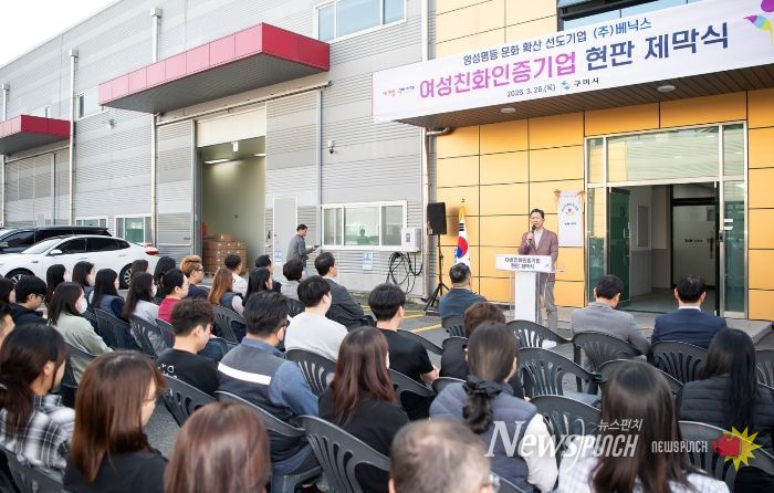 뉴스펀치 박세훈 기자 | 구미시는 지난 26일 ㈜베닉스에서 ‘구미시 여성친화기업 인증 현판 제막식’을 개최하고 여성 친화적 근무환경 확산에 나섰다.