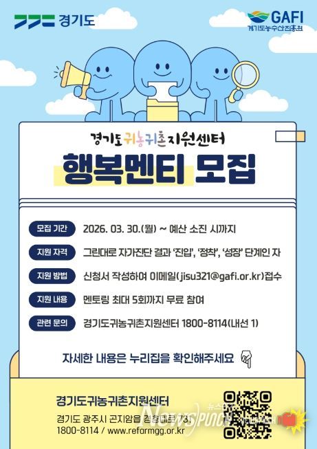 뉴스펀치 박상훈 기자 | 경기도와 경기도농수산진흥원이 운영하는 경기도귀농귀촌지원센터는 경기도로 귀농·귀촌을 희망하는 도시민과 초기 정착 단계의 귀농귀촌인을 대상으로 ‘2026년 귀농귀촌 행복멘토링 행복멘티’를 상시 모집한다.
