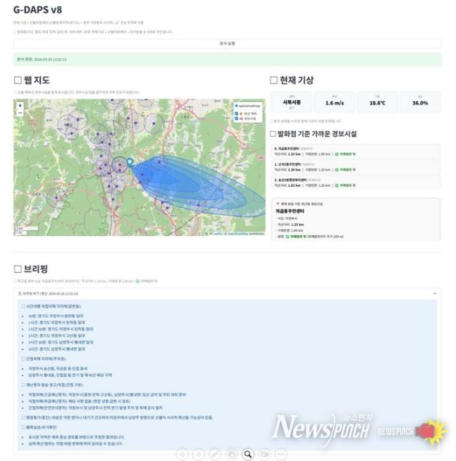 기상 상황과 산불위험예보 및 발생 이력, 민방위 경보시설 가청 범위를 웹 지도에 시각화하여 보여준다. 이를 바탕으로 산불 위험을 30분 단위로 분석해 직접 피해를 입는 읍면동 단위까지 피해 지자체를 파악한다. 근무자는 이 정보를 활용해 특정지역에 대한 경보 발령, 재난문자 발송 등을 할 수 있다.
