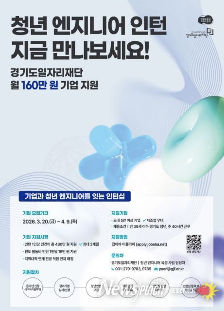 뉴스펀치 박상훈 기자 | 경기도일자리재단이 ‘청년 엔지니어 육성사업 : 지역 청년 채용연계형 인턴십’ 참여기업을 4월 9일까지 모집한다. 도내 기업과 청년을 연계해 실무 중심 인턴십을 지원하는 사업이다. 최근 ‘경력직 같은 신입’을 선호하는 채용 흐름에 대응해 현장 중심 인재 양성과 기업의 채용 수요 연계를 위해 추진한다.