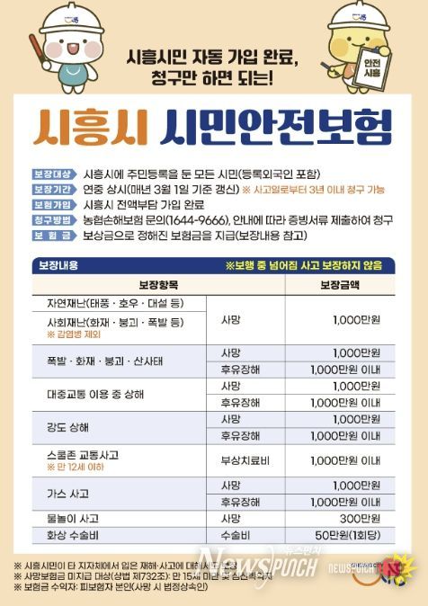 뉴스펀치 박상훈 기자 | 시흥시는 각종 재난과 사고로부터 피해를 본 시민에 대해 생활 안정을 지원하기 위해 ‘시흥시 시민안전보험’을 연중 운영하고 있다.