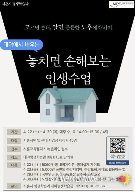 프로그램은 총 4회 과정으로, 시흥시민과 관내 사업장 재직자 40명을 대상으로 진행된다. 주요 내용은 ▲5060 인생 네비게이션, 생애설계 가이드(4월 22일) ▲건강보험 제대로 활용하는 법(4월 23일) ▲국민연금 노후 소득보장 필수지식(4월 29일) ▲노인장기요양보험 활용 정보(4월 30일) 등으로 구성돼, 중장년층의 안정적인 노후 준비를 위한 필수 정보를 제공한다.
