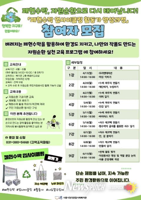 참여자들은 폐현수막을 활용해 직접 작품을 제작하며 자원순환의 가치를 체험하게 된다. 또한 교육 수료 후에는 주민 중심의 자원순환 봉사단 활동으로 연계돼 지역 내 환경보호 실천 활동을 이어갈 예정이다.