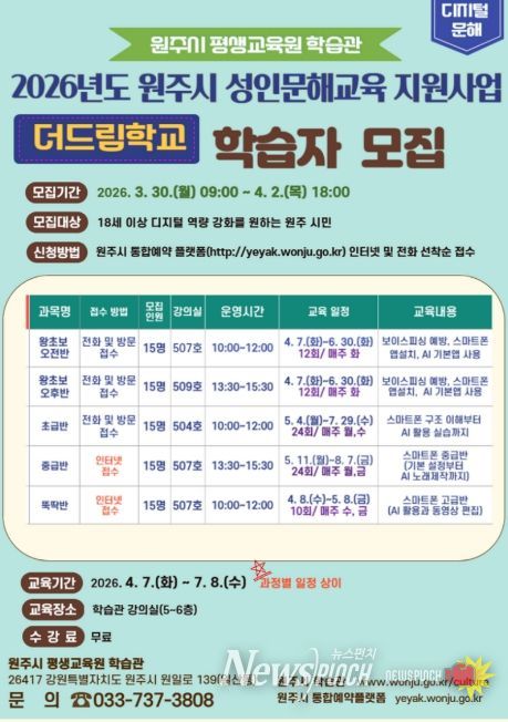 뉴스펀치 조평훈 기자 | 원주시 평생교육원 학습관은 시민의 디지털 활용 역량 향상과 디지털 격차 해소를 위해 ‘2026년 더드림학교 더터치반(디지털 문해교육)’을 확대 운영한다.