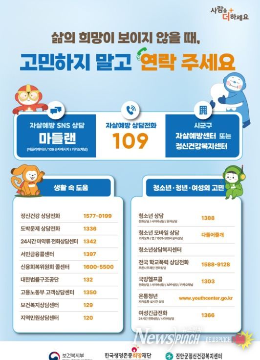 한편, 주변에 우울감으로 힘들어하거나 말하기 어려운 고민이 있어 고통받는 가족·지인이 있다면 자살예방 상담전화(109) 또는 정신건강 위기상담전화를 통해 24시간 전문가의 상담을 받을 수 있다.