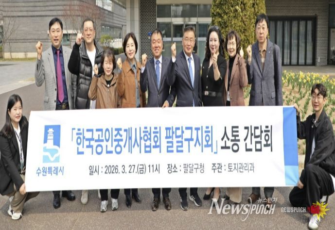 뉴스펀치 박상훈 기자 | 수원시 팔달구는 지난 27일 구청장실에서 박찬국 한국공인중개사협회 팔달구지회장을 비롯한 지회 운영위원과 관계 공무원 등 12명이 참석한 가운데 '한국공인중개사협회 팔달구지회 간담회'를 개최했다.