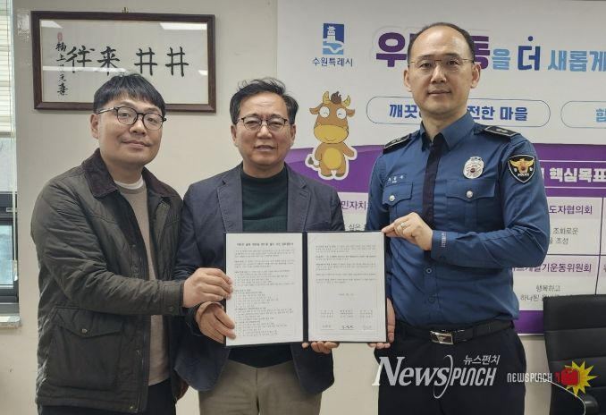 뉴스펀치 박상훈 기자 | 수원시 팔달구 우만1동은 2026년 3월 27일, 주민 생활안전 강화를 위한 ‘어두운 골목 태양광 센서등 설치사업’의 원활한 추진을 위해 우만1동 행정복지센터·우만1동 주민자치회·팔달경찰서 간 서면 업무협약을 체결했다.