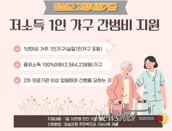 뉴스펀치 정홍균 기자 | 임실군은 고향을 사랑하는 마음으로 후원한 ‘고향사랑기금’을 활용해 ‘저소득 1인 가구의 간병비 지원 사업’을 4월부터 본격 시행하여 고독사 예방과 사회적 안전망 강화에 앞장설 계획이다.