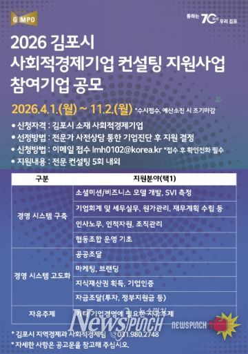 뉴스펀치 박상훈 기자 | 김포시가 관내 사회적경제기업의 지속 가능한 성장과 자생력 강화를 위해 ‘사회적경제기업 역량강화 컨설팅 지원사업’ 참여기업을 오는 11월까지 수시 모집한다.