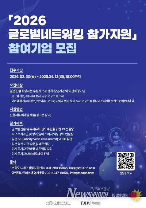 뉴스펀치 박상훈 기자 | 수원특례시가 ‘2026 글로벌네트워킹 참가지원’에 참여할 벤처·창업 기업 7개사를 3월 30일부터 4월 13일까지 모집한다.