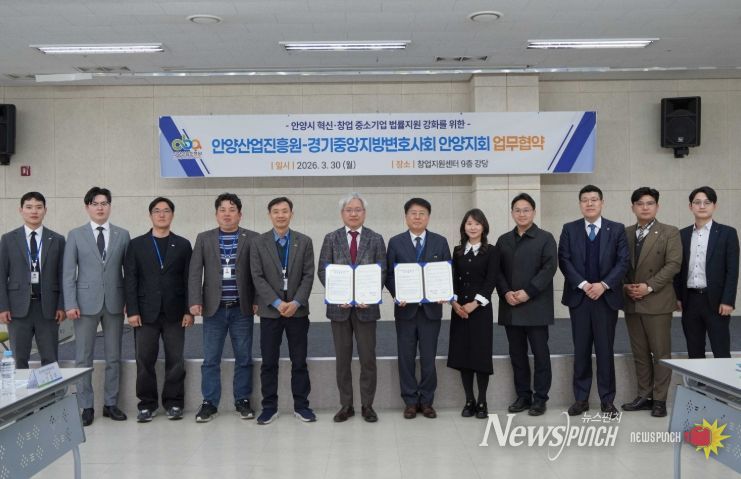 뉴스펀치 박상훈 기자 | 안양산업진흥원은 30일 안양 창업지원센터 9층 강당에서 지역기업의 ESG 경영 지원과 법률 애로 해소를 위한 협력체계 구축을 위해 경기중앙지방변호사회 안양지회와 업무협약을 체결했다고 밝혔다.