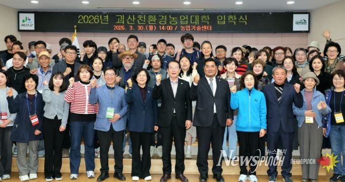 뉴스펀치 이현승 기자 | 충북 괴산군은 30일 농업기술센터에서 ‘2026년 괴산친환경농업대학’ 입학식을 열고 교육생 79명을 맞았다고 밝혔다.