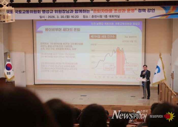 맹성규 국토위원장은 30일 춘천시청 대회의실에서 ‘은퇴자마을 조성과 운영’을 주제로 정책 강연을 개최했다. 맹성규 위원장은 은퇴자마을 조성 및 운영에 관한 특별법을 대표발의했으며 지난 17일 해당 법안이 공포됐다. 이날 강연에는 은퇴자마을 특별법을 공동 발의하며 법안 통과를 함께 이끈 허영 국회의원도 참석했다.
