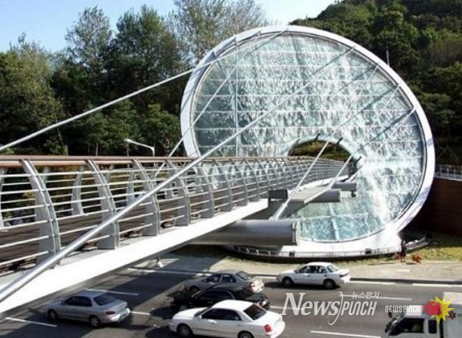 2004년 완공된 폭 3.2m, 길이 50m, 높이 6.3m의 아쿠아아트 육교는 프랑스의 유명 건축디자이너인 ‘다비드 피에르 잘리콩’이 설계한 육교로 독특한 디자인의 워터스크린과 육교가 우면산 경관과 한데 어우러져 프랑스 건축의 예술성과 한국의 풍수지리학적 전통성을 현대 건축설계에 조화롭게 반영했다는 평을 받았다. 워터스크린은 앵커와 케이블을 이용해 우면산에 직접 연결하고 육교의 하중을 지지하도록 설계해 비스듬한 원반 구조의 워터스크린과 육교 계단이 산 지형에 따라 자연스럽고 균형감 있게 배치된 것이 특징이다.