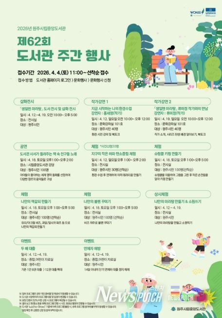 뉴스펀치 조평훈 기자 | 원주시립중앙도서관은 도서관 주간을 맞아 다음 달 12일부터 19일까지 다양한 문화 프로그램을 운영한다.