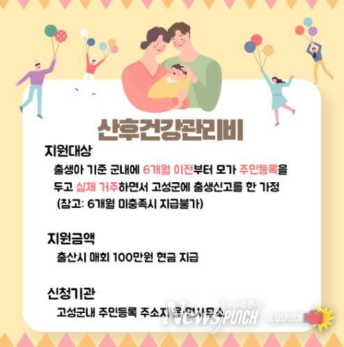 뉴스펀치 박세훈 기자 | 고성군은 출산 가정의 경제적 부담을 덜고 산모의 건강한 회복을 돕기위해 ‘산후건강관리비 지원사업’을 적극 추진하여 출산 친화적 분위기 조성에 앞장서고 있다.
