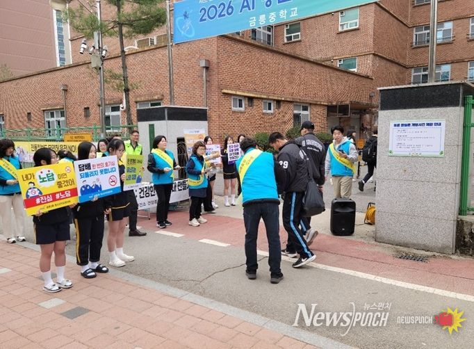 이날 활동에서는 학교 정문에 확성기(스피커)를 설치해 금연 관련 노래를 송출하고, 홍보책자와 홍보 물품을 배부하며 학생들의 금연 실천을 독려했다. 특히 금릉중학교 학생들이 직접 금연 문구가 적힌 팻말을 들고 등교하는 또래 학생들에게 흡연의 위험성을 알리는 ‘학생 주도형’방식으로 진행됐다.