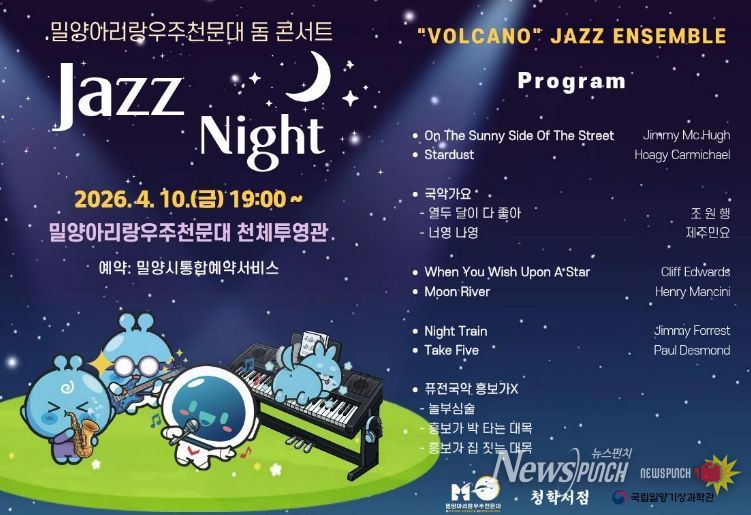 뉴스펀치 박세훈 기자 | 밀양문화관광재단은 오는 4월 10일 밀양아리랑우주천문대 천체투영관에서 우주와 음악이 결합한 특별한 문화 행사 ‘재즈 나이트(Jazz Night)’를 개최한다.