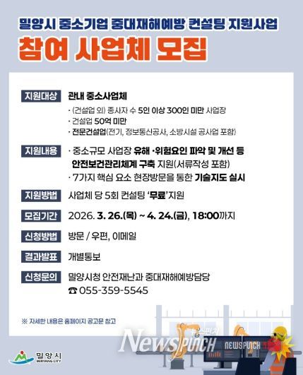 뉴스펀치 박세훈 기자 | 경남 밀양시는 안전보건관리체계 구축에 어려움을 겪는 관내 중소기업을 대상으로 ‘2026년 밀양시 중대재해예방 컨설팅’ 사업을 추진한다고 밝혔다.