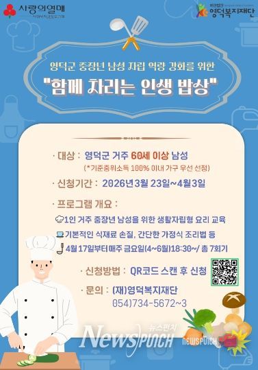 뉴스펀치 박세훈 기자 | 영덕복지재단(이사장 김명용)은 관내 중장년 1인 가구 남성들의 건강한 자립을 지원하기 위해 식생활 교육 프로그램 ‘함께 차리는 인생 밥상’의 참여자를 다음 달 3일까지 모집한다.