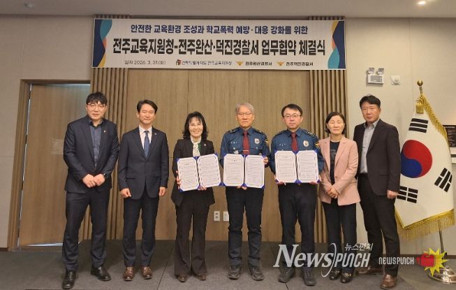전주교육지원청은 31일 전주꽃심호텔 세미나실에서 전주완산경찰서, 전주덕진경찰서와 학교폭력 예방과 학생안전·보호 강화를 위한 업무협약을 체결했다.