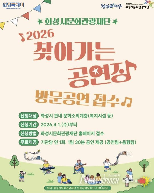 뉴스펀치 박상훈 기자 | 화성시문화관광재단이 오는 4월 1일부터 '2026 찾아가는 공연장’의 방문공연 신청 접수를 시작한다고 밝혔다.