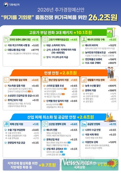 뉴스펀치 정홍균 기자 | 정부는 3월 31일 국무회의에서 중동전쟁 위기 극복을 위한 '2026년 추가경정예산(안)'을 심의·의결했다. 최근 중동전쟁에 따른 민생과 기업·산업에 미치는 영향을 최소화하기 위한 사업들을 중점적으로 발굴하여 반영했다.