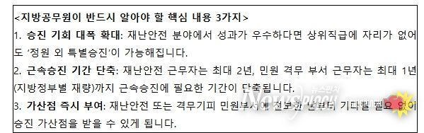근속 승진 기회도 단축된다. 특히 재난안전 분야에서 2년 이상 근무한 공무원의 경우, 현재 1년까지 단축 가능한 근속승진 기간을 최대 2년까지 단축할 수 있도록 의무화했다.