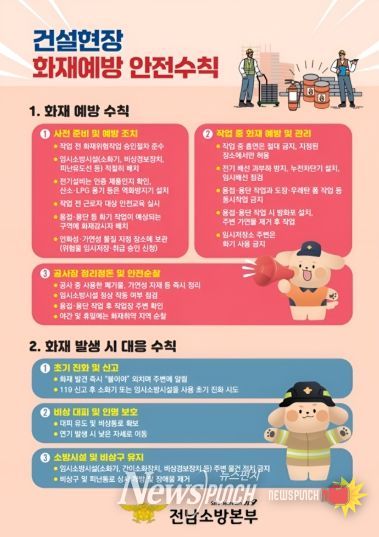 뉴스펀치 최영남 기자 | 여수소방서는 건설현장에서 발생할 수 있는 화재를 예방하고 안전의식을 제고하기 위해 ‘건설현장 화재예방 안전수칙’ 홍보에 나섰다고 밝혔다.