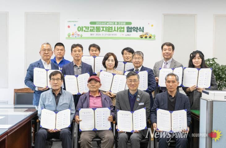 뉴스펀치 박세훈 기자 | 남해군은 지난 3월 27일 관내 중·고등학생의 안전한 야간 귀가 지원을 위해 ‘2026년 중·고교생 야간교통지원사업’ 업무협약을 체결하고, 사업 참여 택시운송사업자들을 대상으로 관련 교육을 실시했다.