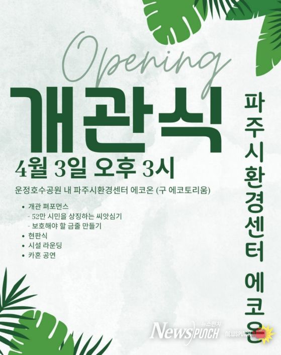 뉴스펀치 박상훈 기자 | 파주시는 오는 4월 3일 운정호수공원 내 에코토리움에서 '파주시환경센터 에코온' 개관식을 열 예정이다.