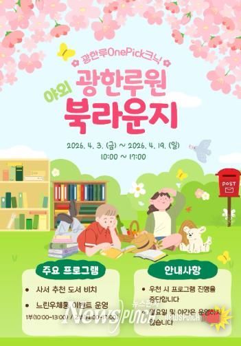 뉴스펀치 정홍균 기자 | 남원어울림도서관은 오는 4월 3일부터 19일까지 광한루원 정문 잔디마당에서 2026년 상반기 '광한루원 야외 북라운지'를 운영한다고 밝혔다.