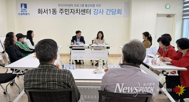 뉴스펀치 박상훈 기자 | 수원시 팔달구 화서1동 주민자치회는 지난 3월 31일 화서1동 행정복지센터 3층 강의실에서 2026년 주민자치센터 프로그램 강사 간담회를 개최했다. 간담회에는 화서1동장 등 관계 공무원 3명과 주민자치회장, 주민자치센터 실장, 프로그램 강사 9명 등 총 14명이 참석했다.