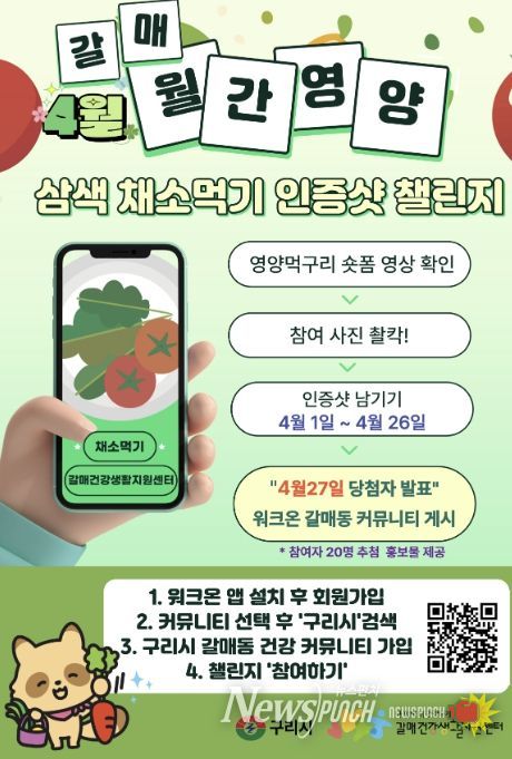 뉴스펀치 박상훈 기자 | 구리시 갈매건강생활지원센터는 오는 4월 1일부터 26일까지 주민 주도형 식습관 개선 사업인 ‘나를 위한 건강미션 - 갈매 월간영양’의 두 번째 프로그램으로 ‘내 식탁 위 무지개를 찾아라! 삼색 채소 먹기 인증사진 챌린지’를 운영한다고 밝혔다.