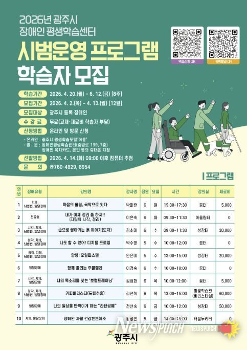 모집 기간은 2일부터 13일까지며 광주시 평생학습포털 ‘어흥’을 통한 온라인 접수 또는 장애인 평생학습센터 방문 접수가 가능하다. 방문 신청 시에는 장애인 복지 카드와 본인 명의 휴대전화를 지참해야 한다.
