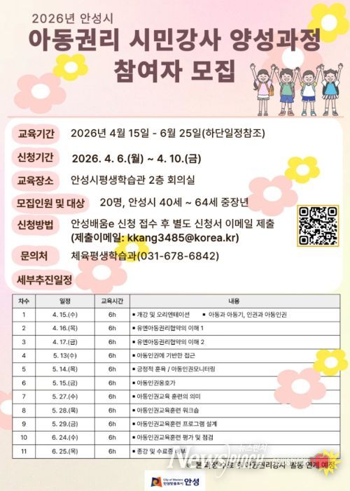 뉴스펀치 박상훈 기자 | 안성시는 아동친화도시로서 아동권리 인식 확산과 시민강사 양성을 위해 '아동권리 시민강사 양성과정' 참여자를 모집한다.