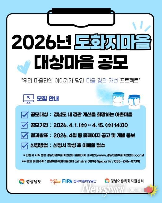 뉴스펀치 박세훈 기자 | 경상남도는 어촌마을의 경관개선과 관광자원으로서의 활용을 위해 추진하는 ‘도화지 마을 사업’ 참여 마을을 공개 모집한다고 밝혔다.