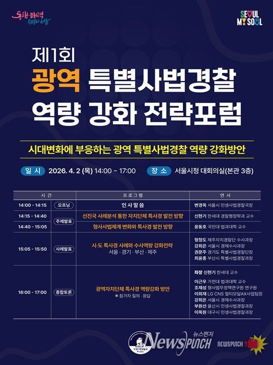 뉴스펀치 박상훈 기자 | 서울시가 2일 오후 2시에 서울시청 대회의실에서'제1회 광역 특별사법경찰 역량 강화 전략포럼'을 개최한다. 관련 연구자와 함께 시‧도 특사경 전담부서장 등이 참석해 해외사례와 현장 노하우 등을 공유하고 광역 특사경 발전방향을 모색한다.